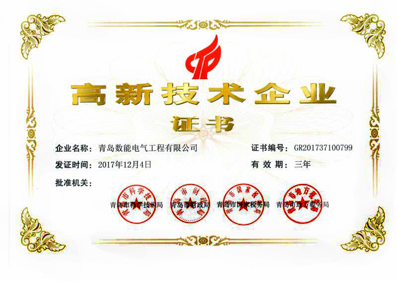 2017年12月,青島數(shù)能電氣工程有限公司榮獲由青島市科學(xué)技術(shù)局、青島市市財(cái)政局、青島市國(guó)家稅務(wù)局和青島市地方稅務(wù)局批準(zhǔn)頒發(fā)的高新技術(shù)企業(yè)認(rèn)定。